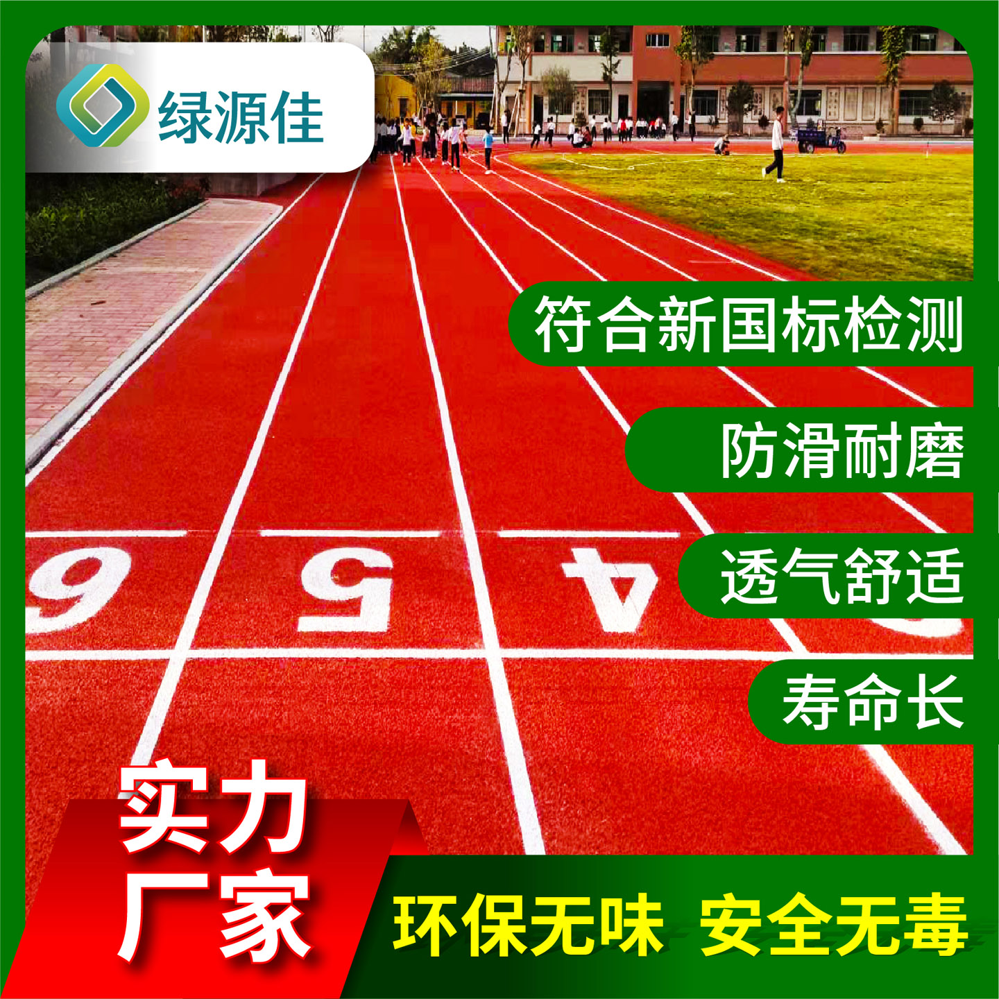 產品性能 色彩鮮艷、耐沖擊、彈性適中、環保無味、使用壽命長、防滑耐磨、透氣舒適、優質保質 產品優勢 新國標環保無味,紋路清晰,顏色亮麗,超強耐磨,防滑設計,彈性舒適,施工簡便